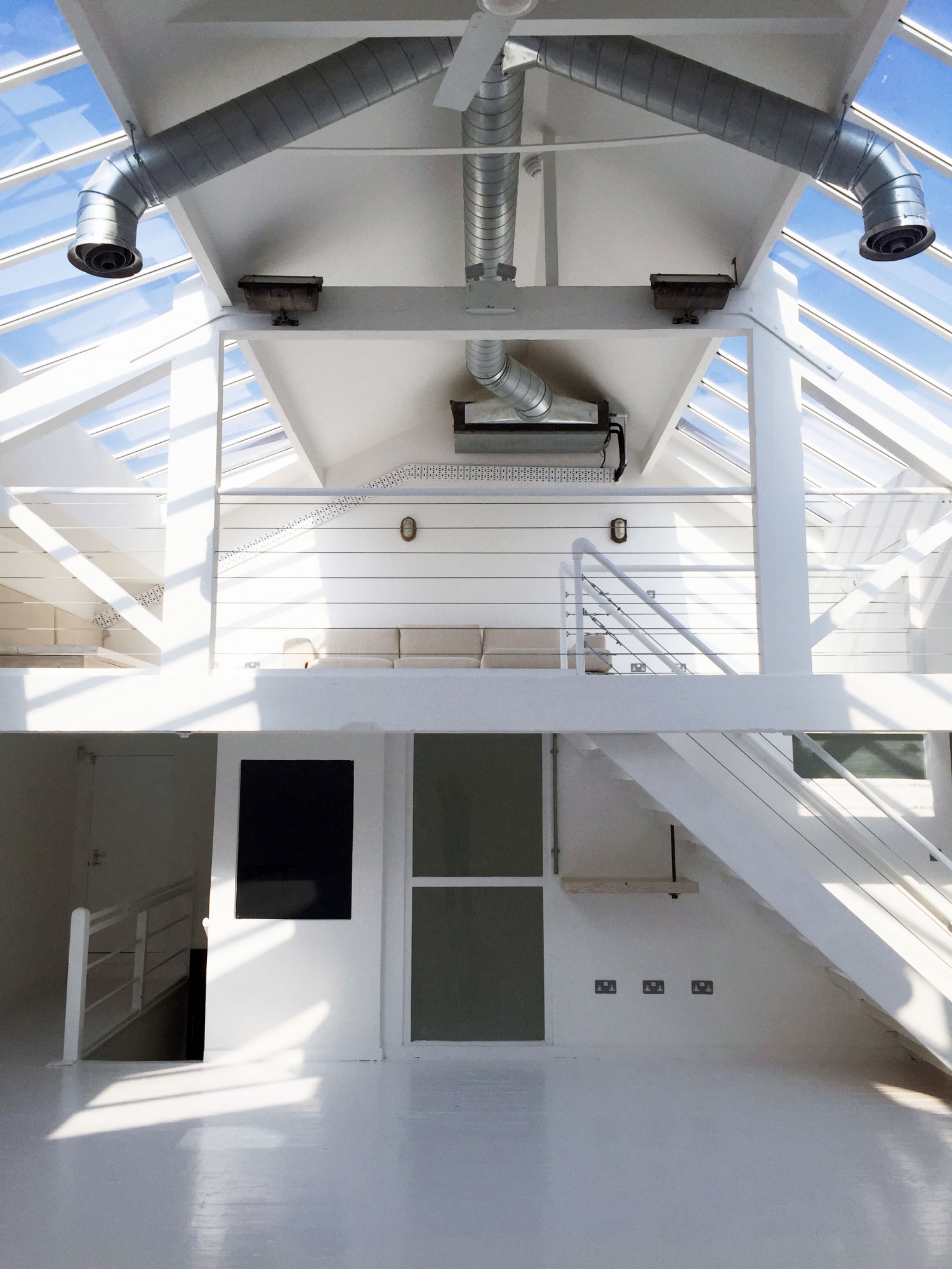 The loft is a 150m² daylight studio with a 50m² mezzanine area, flooded with natural daylight from east and west facing skylights running the length of the ceiling. These are equipped with individually-controlled blackout blinds, allowing you to create the perfect lighting environment.